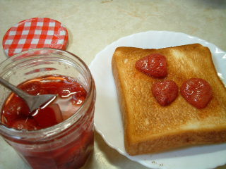 トーストに塗るにはベッチョリしすぎですが、シロップにコーンスターチを加えてまた煮れば苺のソースになるから、今度アイスクリームを作る時に使おうっと。